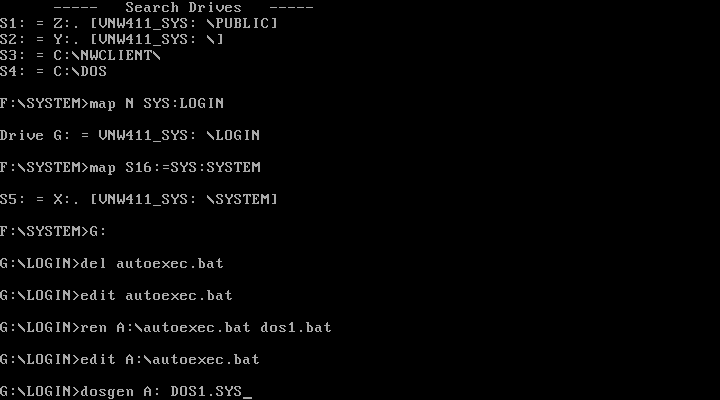 done! Now copy the unique autoexec.bat file (DOS1.BAT) from the disk to SYS:LOGIN with copy A:DOS1.BAT