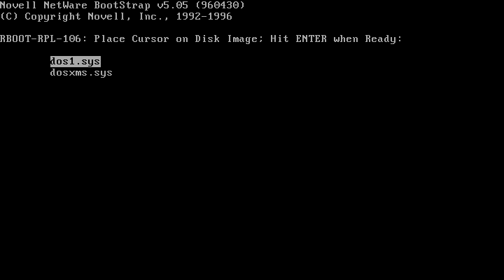 Note that this doesn't work for "old" Novell IPX Remote Boot PROMs - only RPL Boot PROMs (including the Novell Enhanced Boot PROM) are supported. The old IPX Remote Boot PROMs are limited to booting the single NET$DOS.SYS image created earlier.
