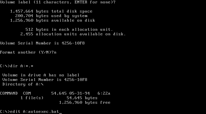 Looks good! Now create an autoexec.bat with edit A:AUTOEXEC.BAT