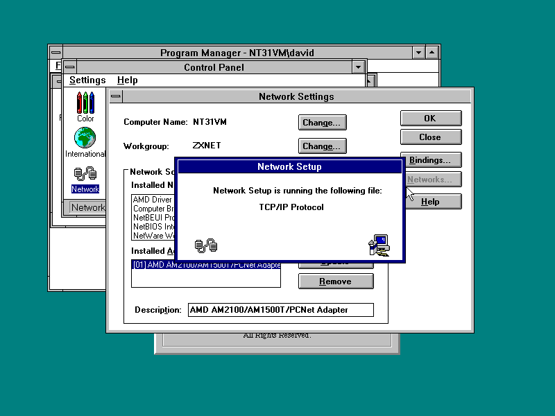 This is being done on the retail version of Windows NT 3.1 with networking already setup and working using an NDIS driver. To install it you'll need the files on a floppy disk or in the root of some other drive. To make things easy, here is a disk image of the intel version. Put the disk in/mount the disk image then open the control panel.