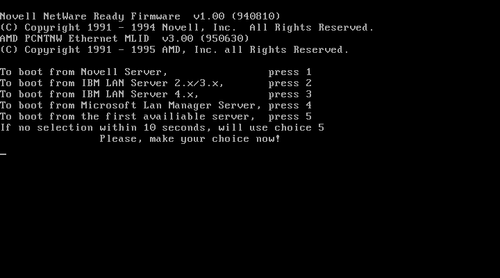 This page covers how to network boot OS/2 Warp 3.0 from a NetWare server using RPL. The process for OS/2 Warp 4.x is probably much the same if it works at all.