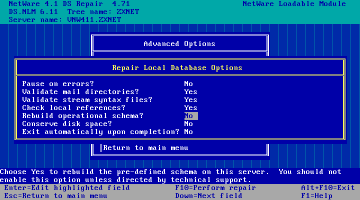 they would have to be repaired before going any further. Hit Esc to leave the editor, and Esc again to leave DSREPAIR.