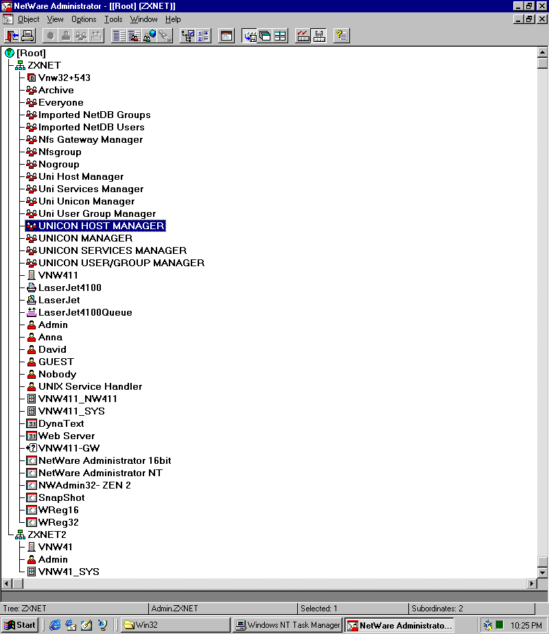 First up, the redundant admin user that got merged in from the NetWare 4.10 box. In NetWare Administrator, just delete it!