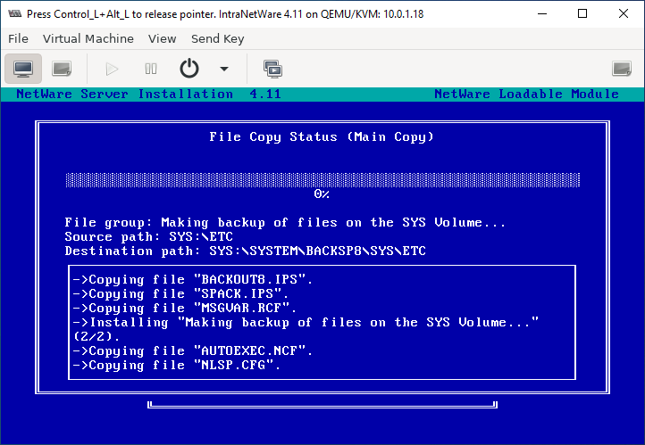 These screenshots were all taken as part of a previous attempt to get NetWare working in KVM. They should work fine for the VM Documented here though.